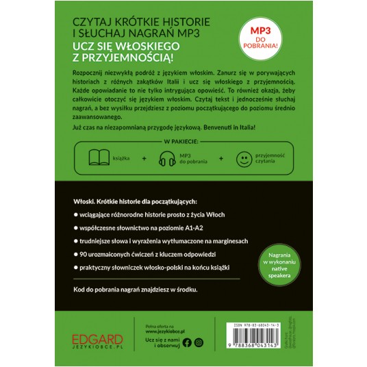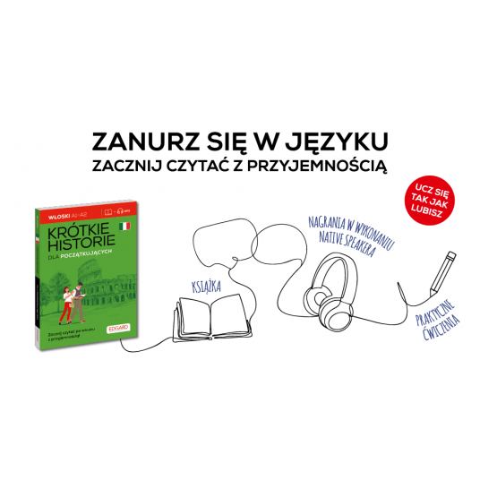 W tej wyjątkowej propozycji dla miłośników Italii Włoski. Krótkie historie. Dla początkujących znajdziesz aż 15 krótkich i wciągających opowiadań, którym towarzyszą jakościowe nagrania czytane przez native speakera, praktyczne tłumaczenia słów na marginesach oraz zestaw ćwiczeń. Teraz możesz otoczyć się językiem włoskim na twoich zasadach – słuchaj, czytaj i ćwicz w dowolnej konfiguracji. Jak to działa?
