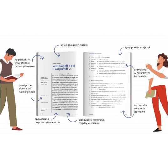 Możesz odtworzyć nagranie opowiadania po włosku w tle i osłuchiwać się z językiem. A następnie, kiedy masz wolną chwilę, usiądź wygodnie i zacznij śledzić tekst, słuchając nagrań lub po prostu przeczytaj opowiadanie. Wolisz odwrotną kolejność – najpierw czytanie, a dopieropóźniej słuchanie? Świetny pomysł! To twój czas z językiem włoskim. Przeczytane, wysłuchane i jeszcze ci mało? Pora na angażujący trening. Sprawdź się, wykonując różnorodne ćwiczenia i utrwal poznane słownictwo.