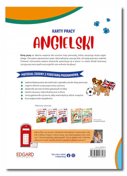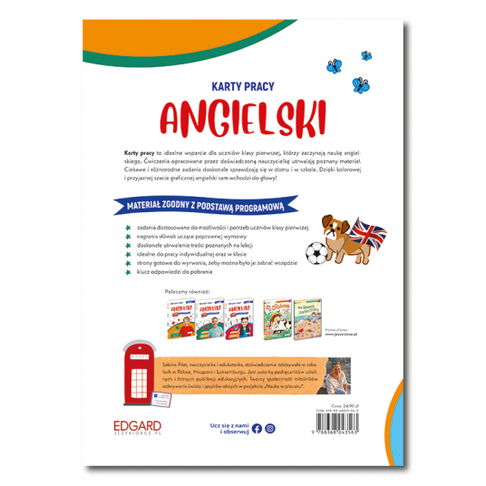 Już pierwszoklasiści mogą uczyć się angielskiego, nie tylko w szkole, ale też w domu. A ty możesz zadbać, by nauka przebiegała w sposób przyjemny, nie obciążający planu dnia, a jednocześnie skuteczny. Wystarczy tylko 5 minut i jedna karta pracy dziennie, by zaciekawić dziecko językiem angielskim, zbudować językową pewność siebie i wzmocnić jego poczucie własnej wartości w szkole i w życiu na lata.