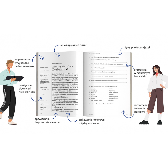 Dzięki wciągającej fabule oraz żywemu językowi poznasz powszechnie używane kolokwializmy i struktury gramatyczne w kontekście, opanujesz nowe słownictwo i kolokacje charakterystyczne dla naturalnego, współczesnego języka niemieckiego i bez trudu zrozumiesz niuanse i różnice kulturowe. To co, czas na niemiecki? Z przyjemnością!