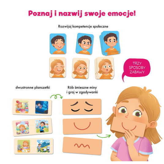 3 sposoby zabawy: gra w minkowe zgadywanki, dopasowywanie do siebie połówek twarzy oraz żetonów z emocjami, gra planszowa dla dwóch osób lub drużyn!