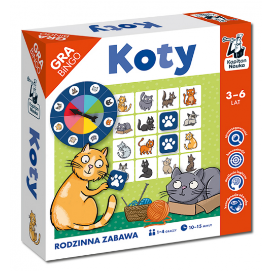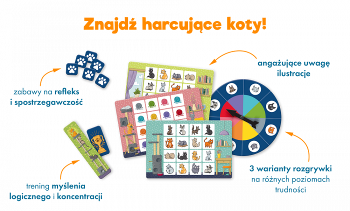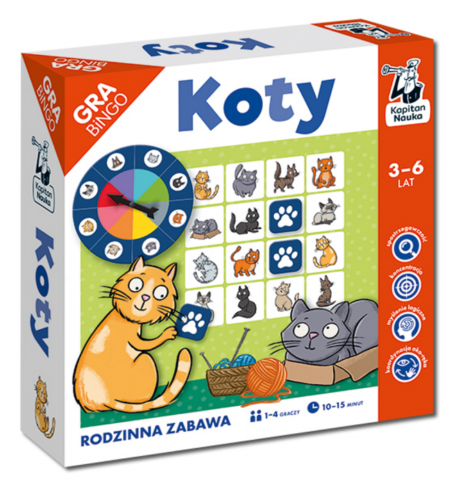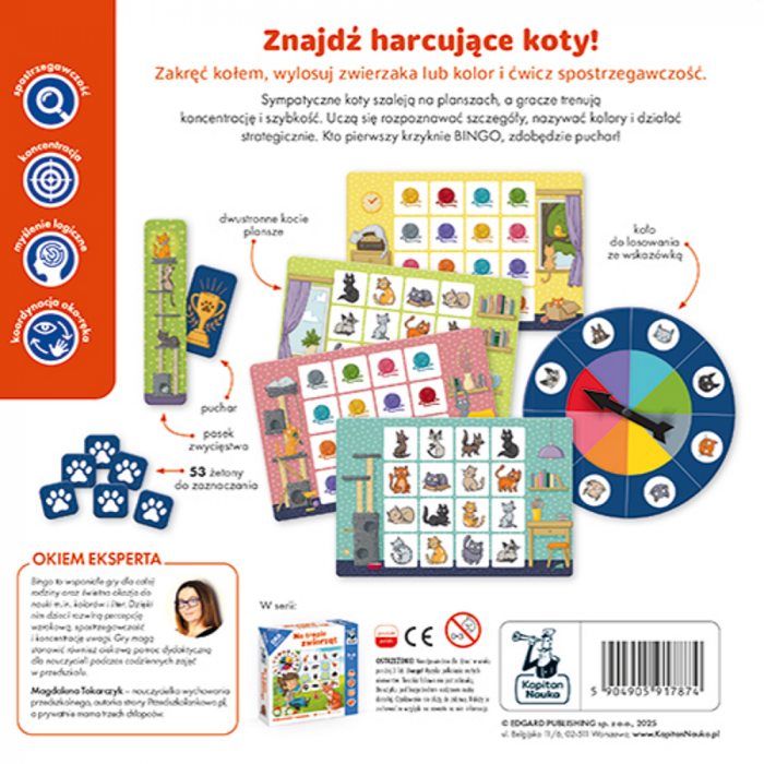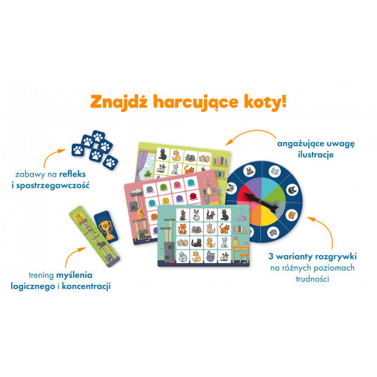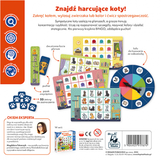 Zakręć kołem, wylosuj zwierzaka lub kolor i ćwicz spostrzegawczość. Sympatyczne koty szaleją na planszach, a gracze trenują koncentrację i szybkość. Uczą się rozpoznawać szczegóły, nazywać kolory i działać strategicznie. Kto pierwszy krzyknie BINGO, zdobędzie puchar!