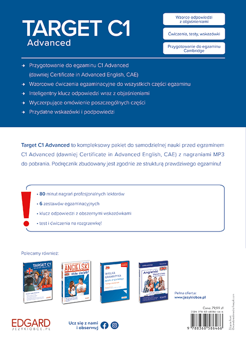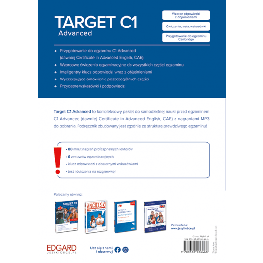 Planujesz zdobyć certyfikat C1 Advanced i potrzebujesz solidnego, zaawansowanego kursu angielskiego? A może już się przygotowujesz, ale wciąż brakuje ci pewności, czy poradzisz sobie ze wszystkimi częściami egzaminu? Z Angielski. Target C1. Advanced zyskasz klarowny plan działania i poczucie pełnej kontroli nad każdym etapem przygotowań – od pierwszego zadania aż po dzień egzaminu!