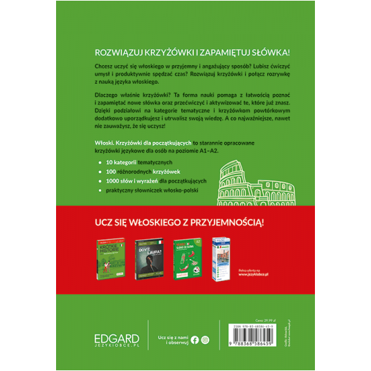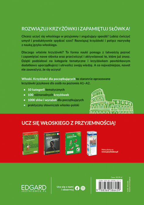 Włoski. Krzyżówki dla początkujących A1–A2 to świetne wsparcie dla wszystkich, którzy rozpoczynają przygodę z językiem. Każda krzyżówka wprowadza nowe słownictwo w atrakcyjny i angażujący sposób. Uczysz się skutecznie i z przyjemnością, a odgadując kolejne hasła, zapamiętujesz słowa na dłużej.
